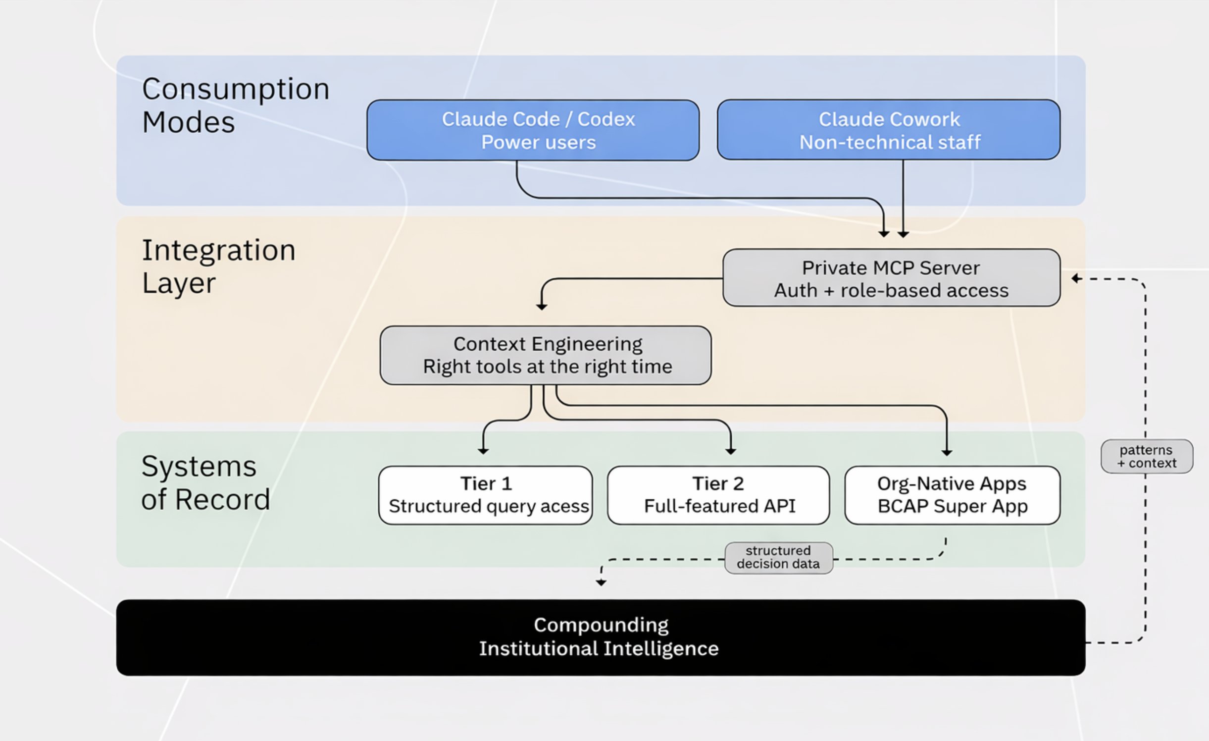 The next ingredient is an agent-accessible interface (e.g. MCP, API, or CLI) engineered to deliver the right context at the right time. We built a private MCP server that bundles all of our systems of record behind a single integration point. Authenticate via OAuth, and your agent has role-based access to everything you'd normally log into a vendor to see. When we add a new data source, everyone gets it at once without any individual setup.