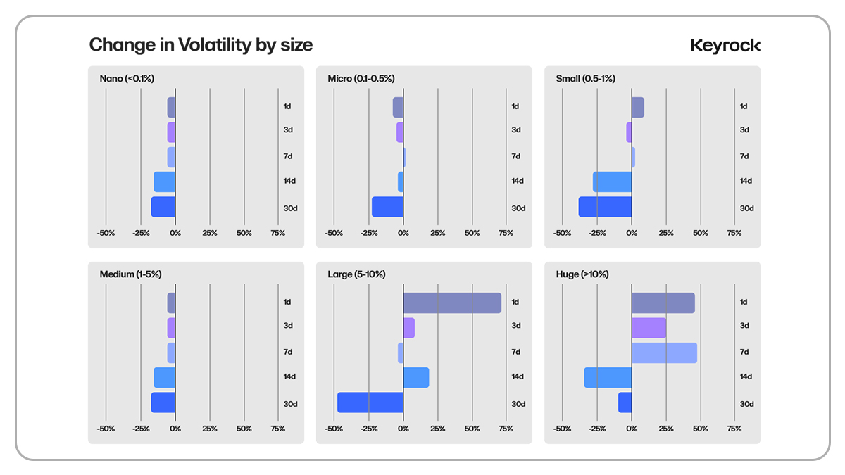 When you scale for relative size, unlocks can look similar in terms of suppression. Frequency becomes the more telling factor, and Keyrock observes consistent downward pressure from smaller, steady unlocks. “Massive unlocks cannot be entirely hedged due to their size and cannot be dumped or unwound within 30 days. As a result, their market effects tend to be more gradual and drawn out.”